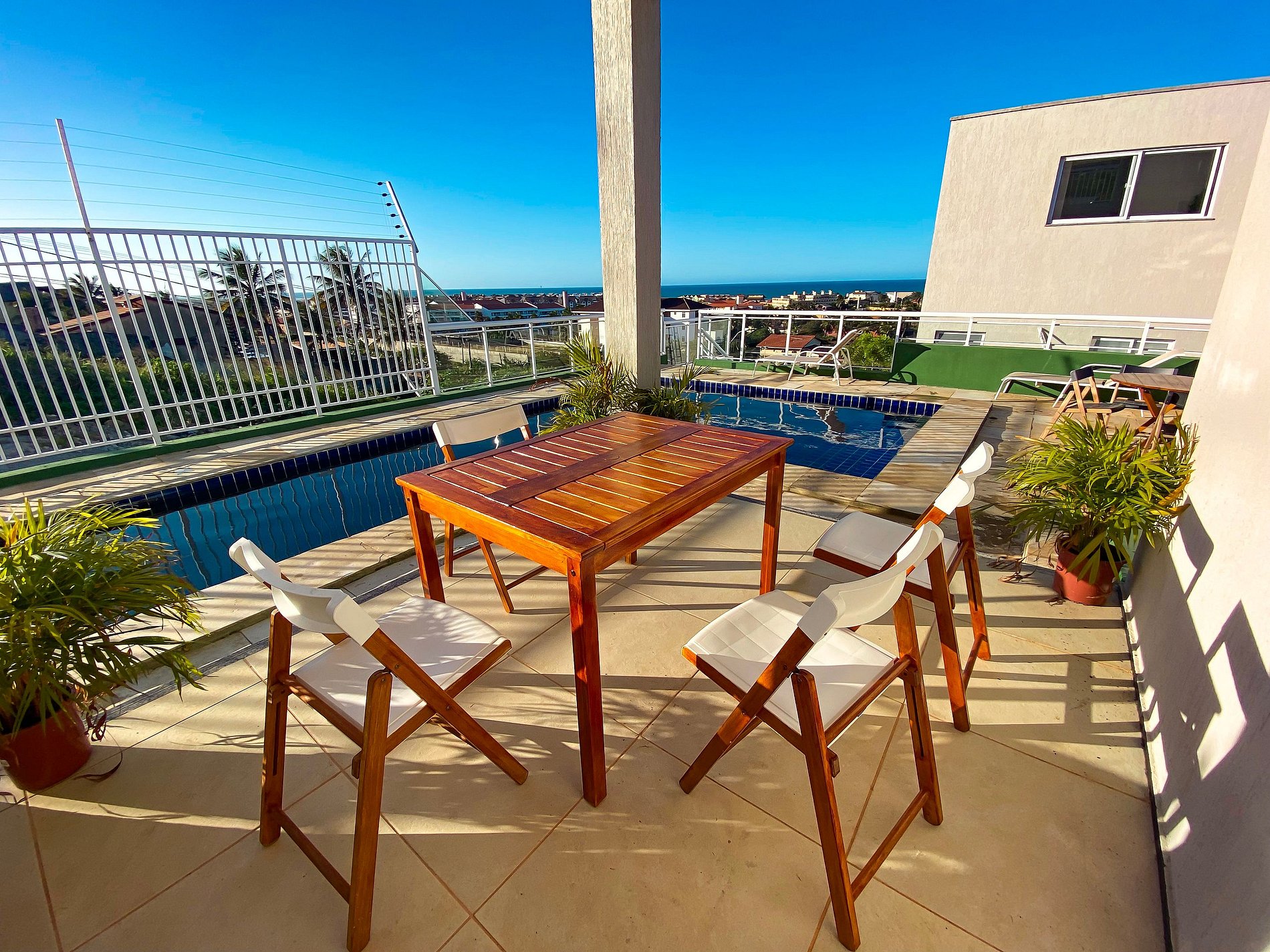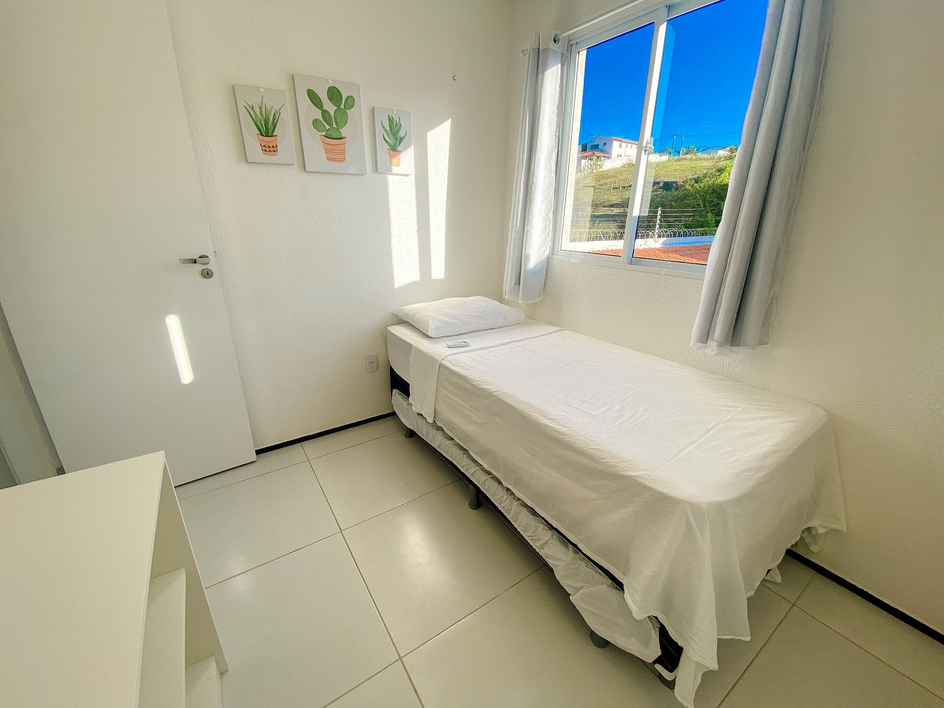 Casa em condomínio moderno, possui uma suíte com cama de casal, uma suíte com cama de solteiro e quarto com uma cama de solteiro, sala com sofá, varanda ampla com mesa e cadeira, cozinha com todos utensílios, roupas de cama e banho, produtos de higiene e um terraço amplo com mesa e vista do mar.