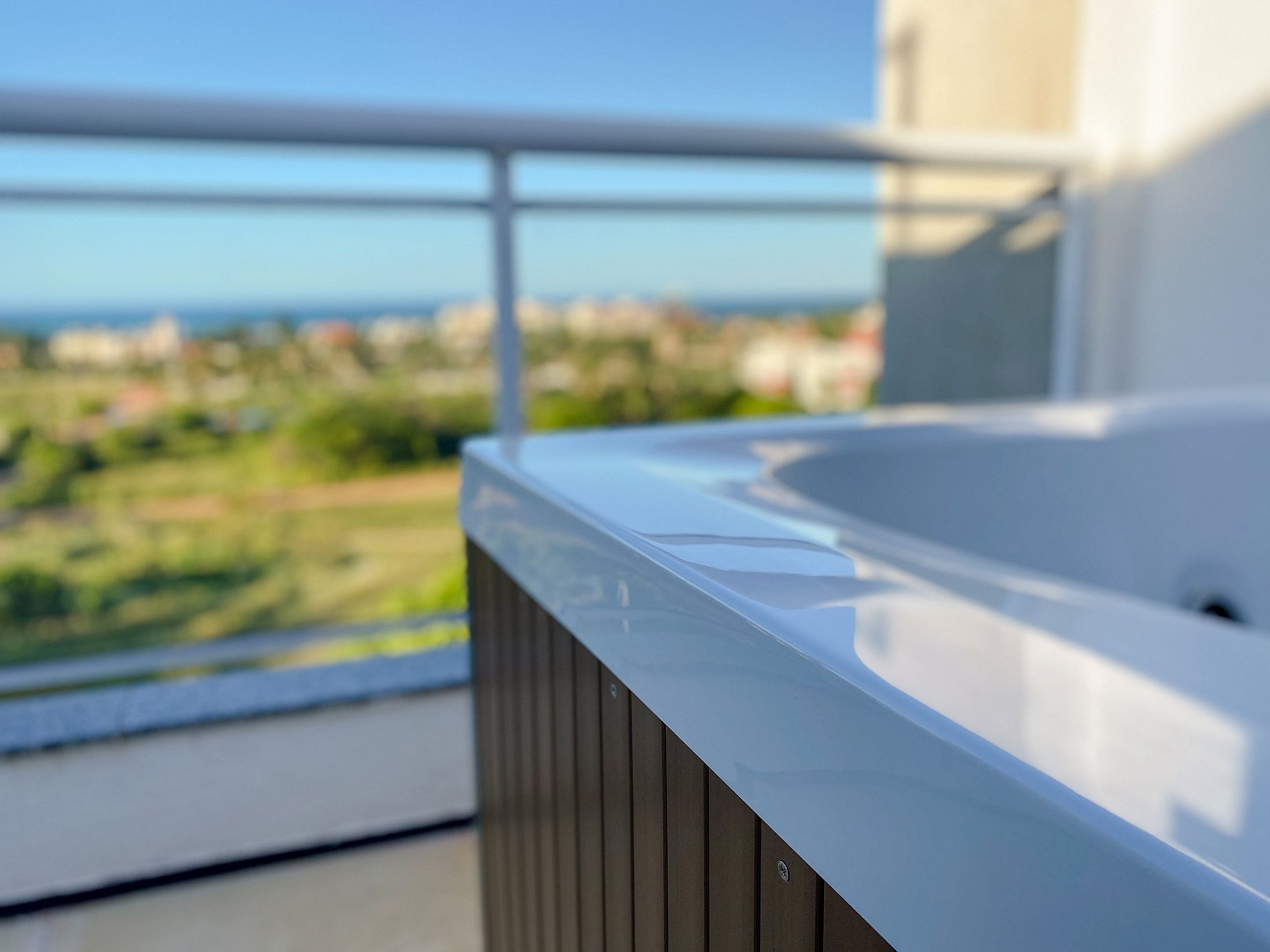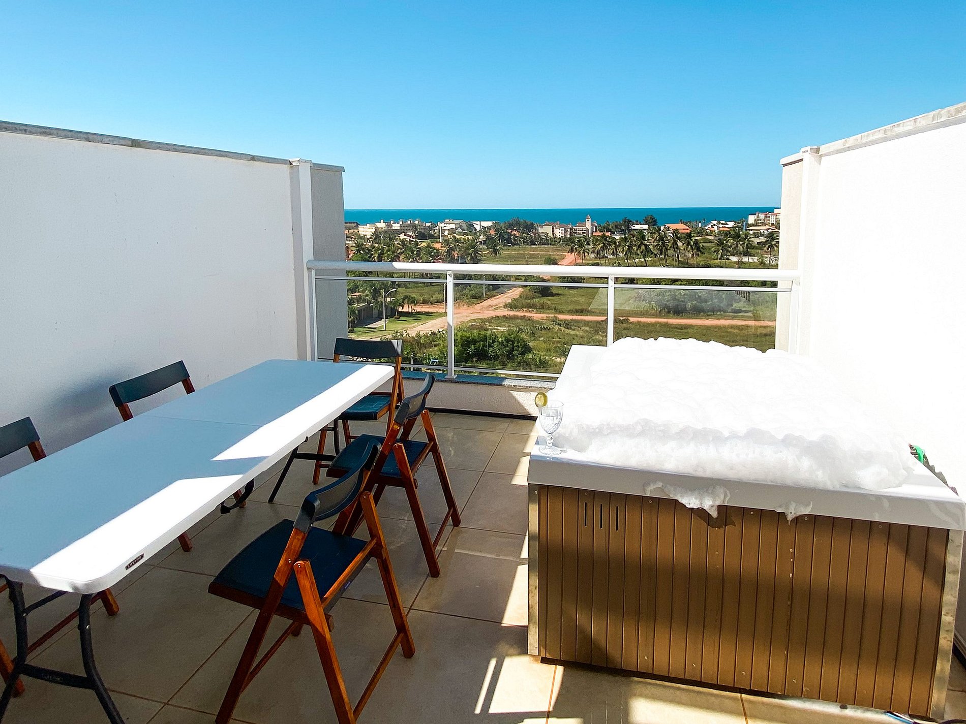 Casa com Jacuzzi em condomínio moderno, possui uma suíte com cama de casal, uma suíte com cama de solteiro e quarto com uma cama de solteiro, sala com sofá, varanda ampla com mesa e cadeira, cozinha com todos utensílios, roupas de cama e banho, produtos de higiene e um terraço com a Jacuzzi amplo com mesa e vista do mar.