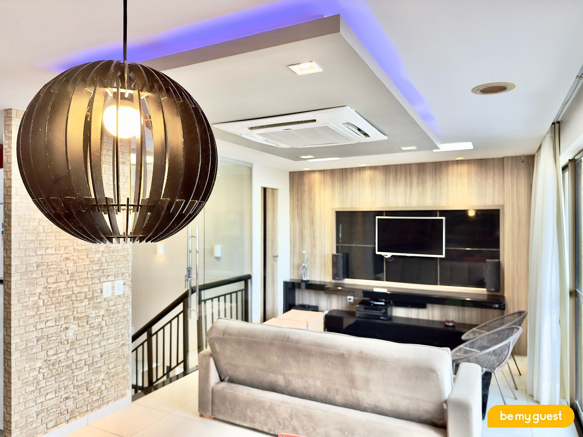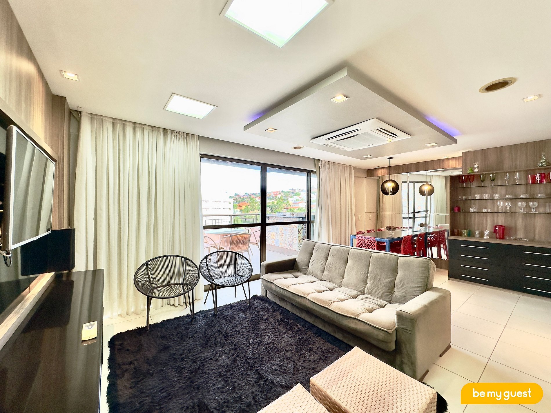 - Sala de estar ampla com sofá confortável, TV Smart e mesa de jantar