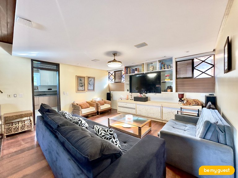 A sala de estar é ampla e integrada à área externa. Conta com sofá confortável, TV Smart e uma decoração acolhedora, perfeita para momentos em grupo ou para relaxar após um dia de praia.