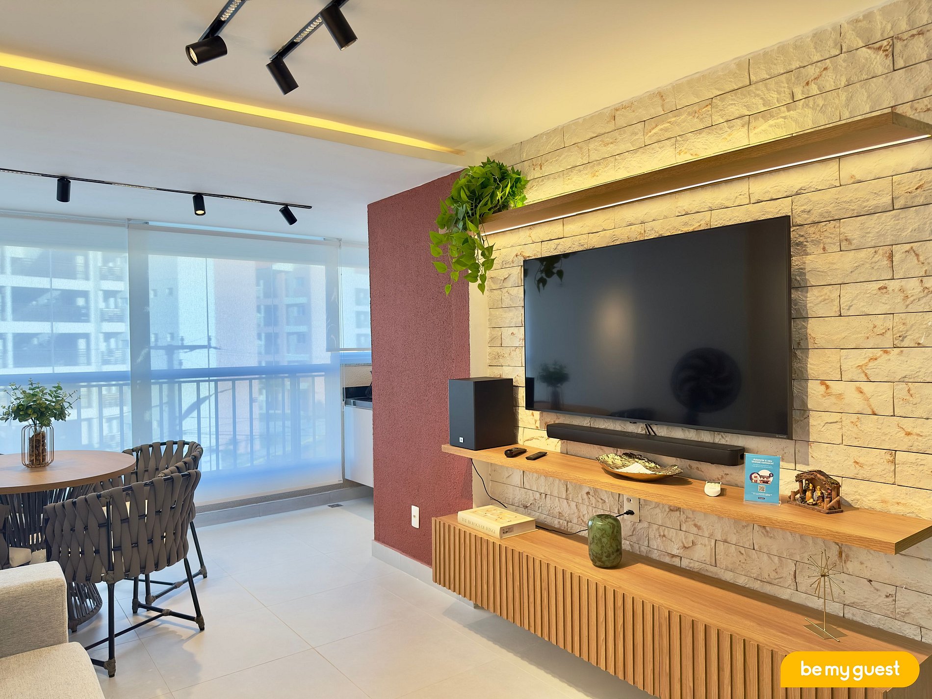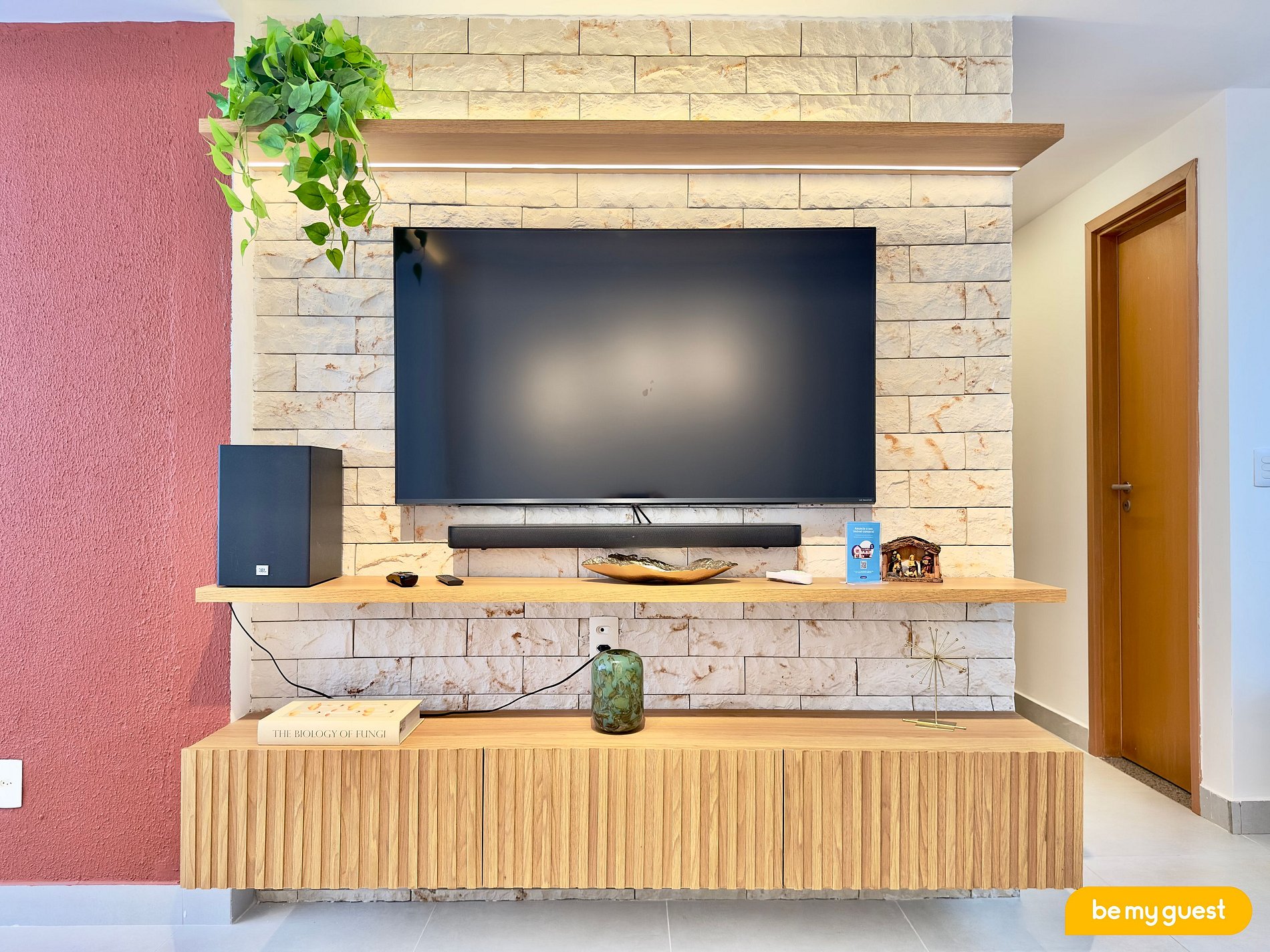 - Sala de Estar muito bem decorada com TV Smart e som JBL, com mesa de jantar e Ar Condicionado