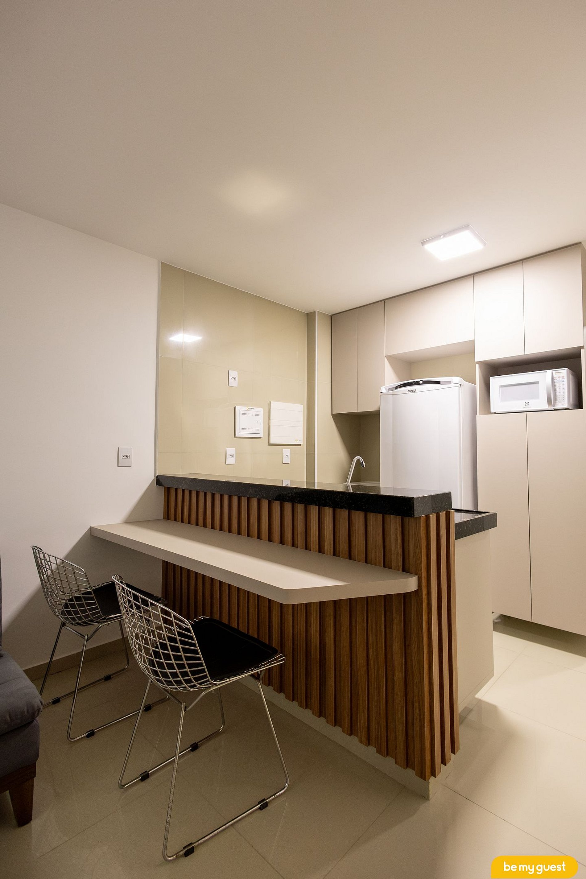 - Cozinha estilo americana integrada à sala, equipada com itens essenciais