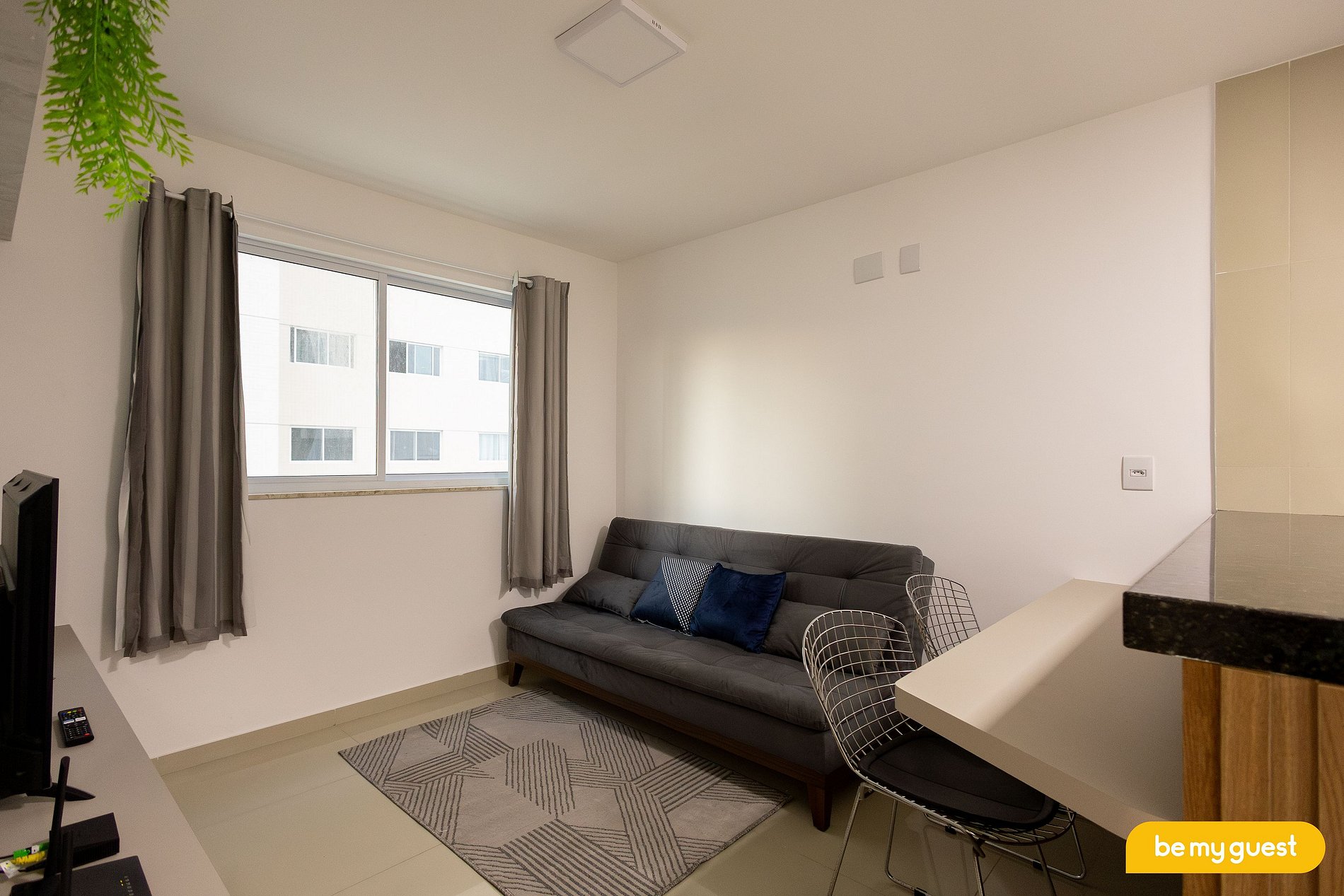 - Sala de estar com decoração moderna, sofá-cama de solteiro, TV Smart e ar-condicionado