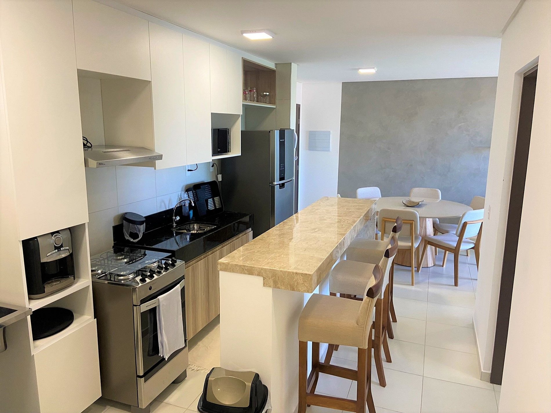 - Cozinha estilo americana equipada com utensílios essenciais