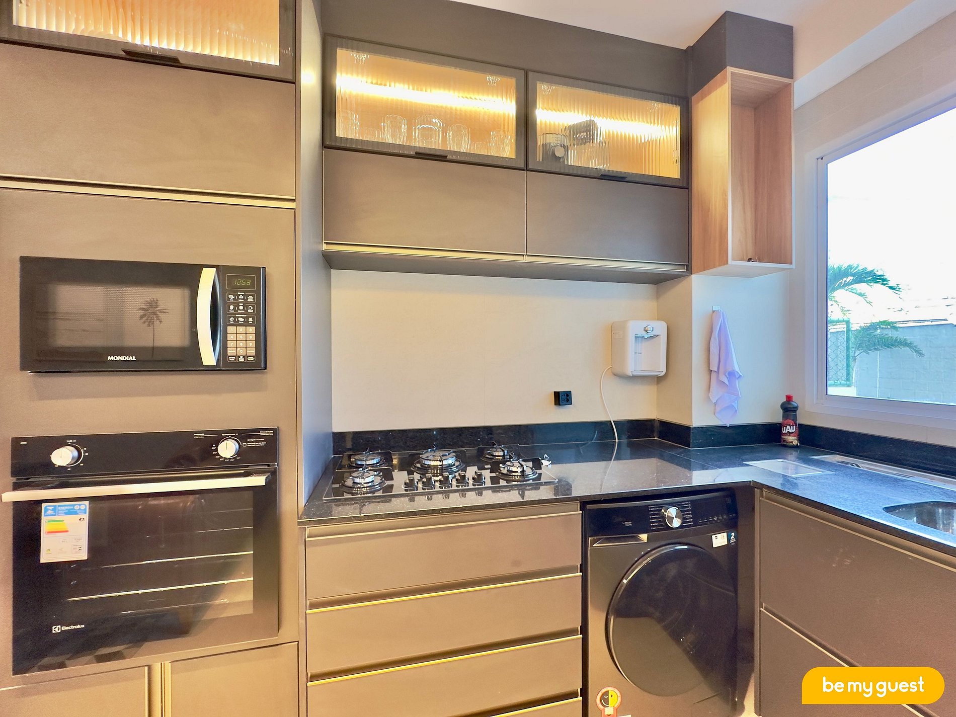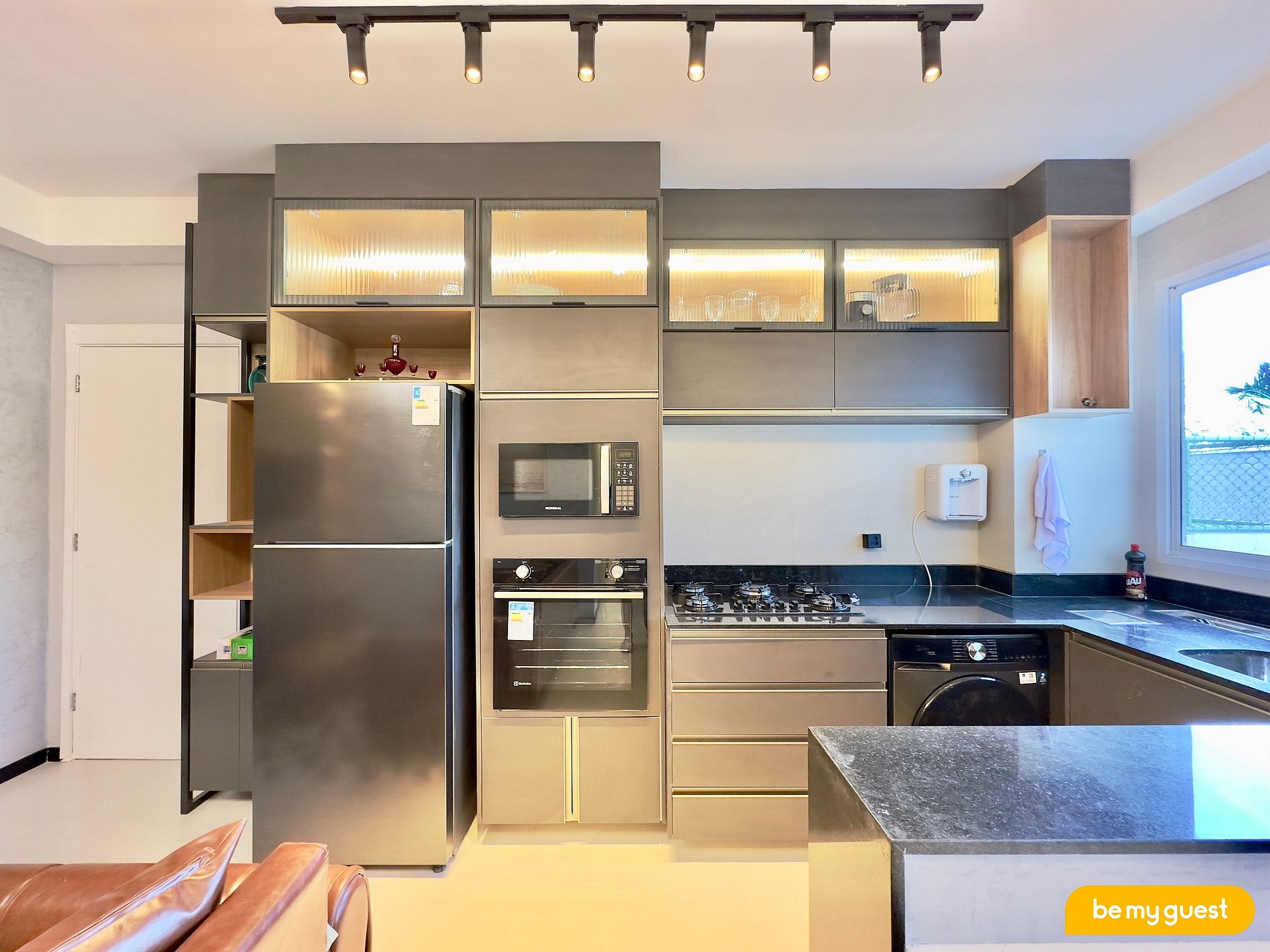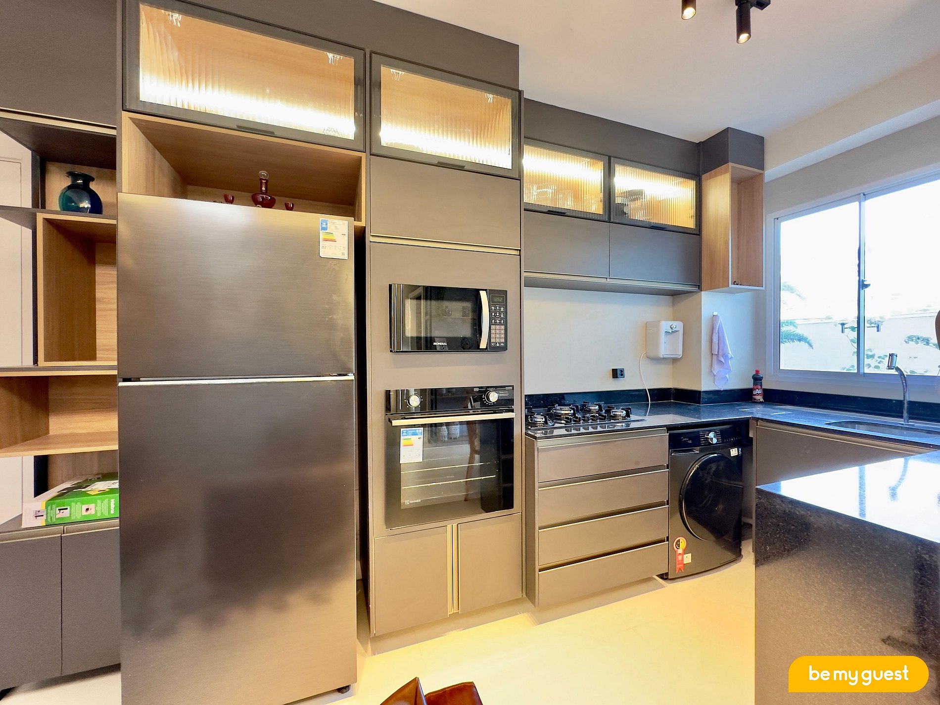 - Cozinha planejada, equipada com itens essenciais e com máquina de lavar roupa