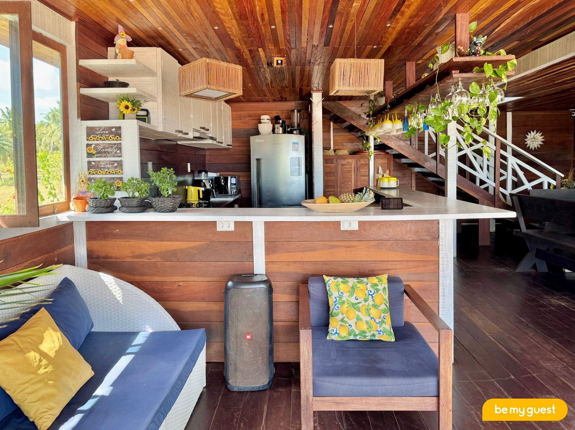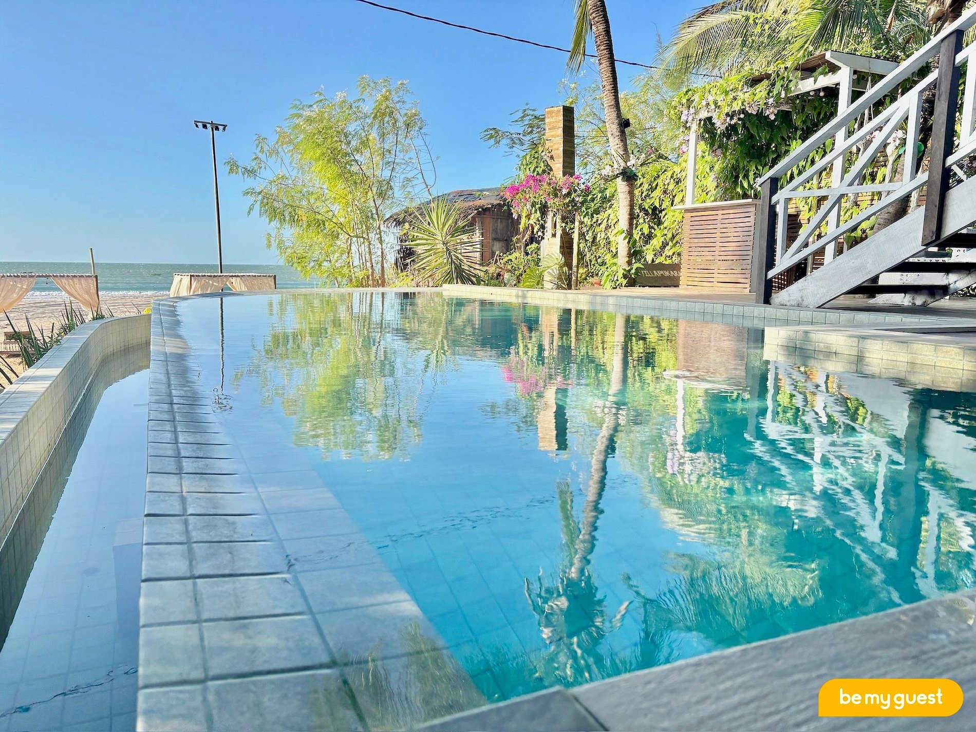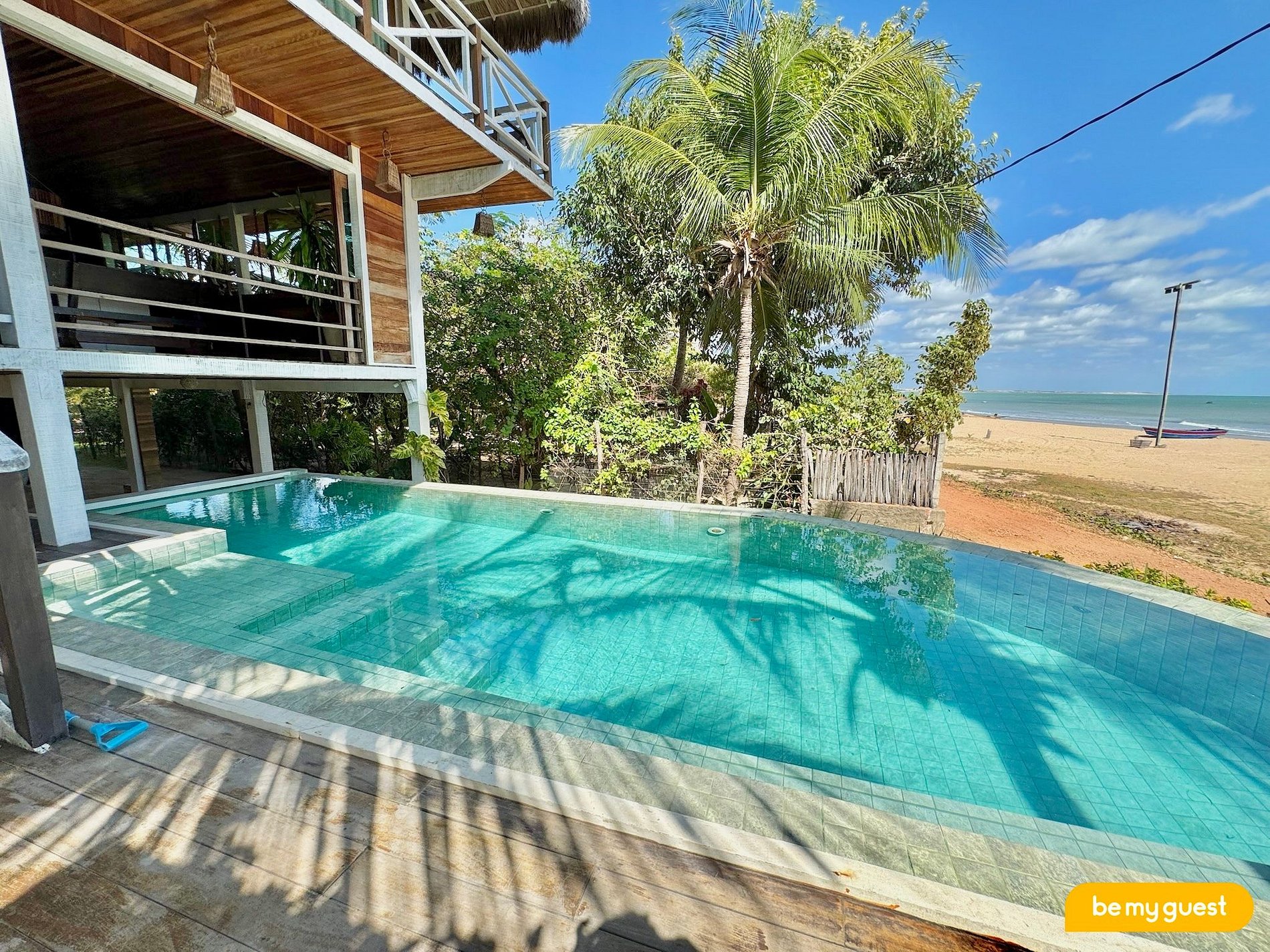 Na área externa, os hóspedes desfrutam de uma piscina com vista panorâmica para o mar, espaço de estar com sofás e poltronas aconchegantes e uma cozinha compartilhada para maior comodidade. Todos os detalhes foram pensados para proporcionar uma estadia relaxante e inesquecível.